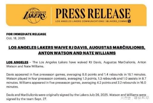 湖人官方:球隊正式裁掉RJ.戴維斯、馬丘利奧尼斯等四名球員